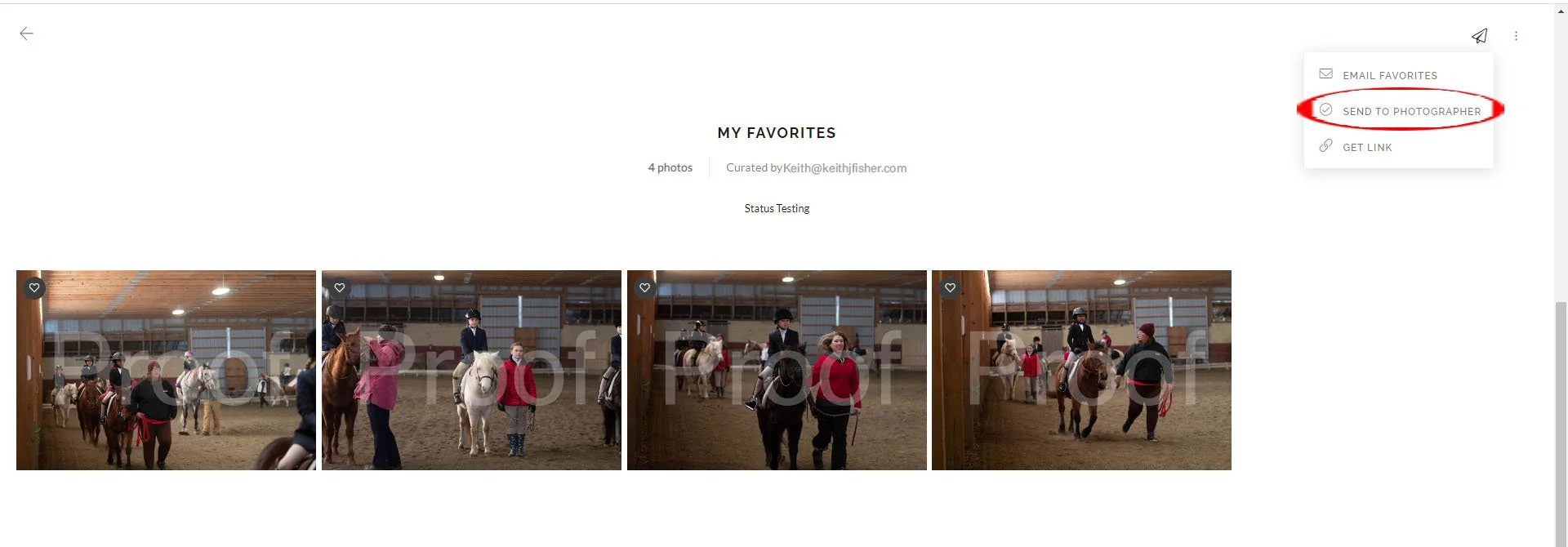 Click the heart icon and select your favorites list. All the photos that you favorited are listed here. If you are ready to place your order, you will want to send your list to me. At the top right of the screen is a paper airplane.